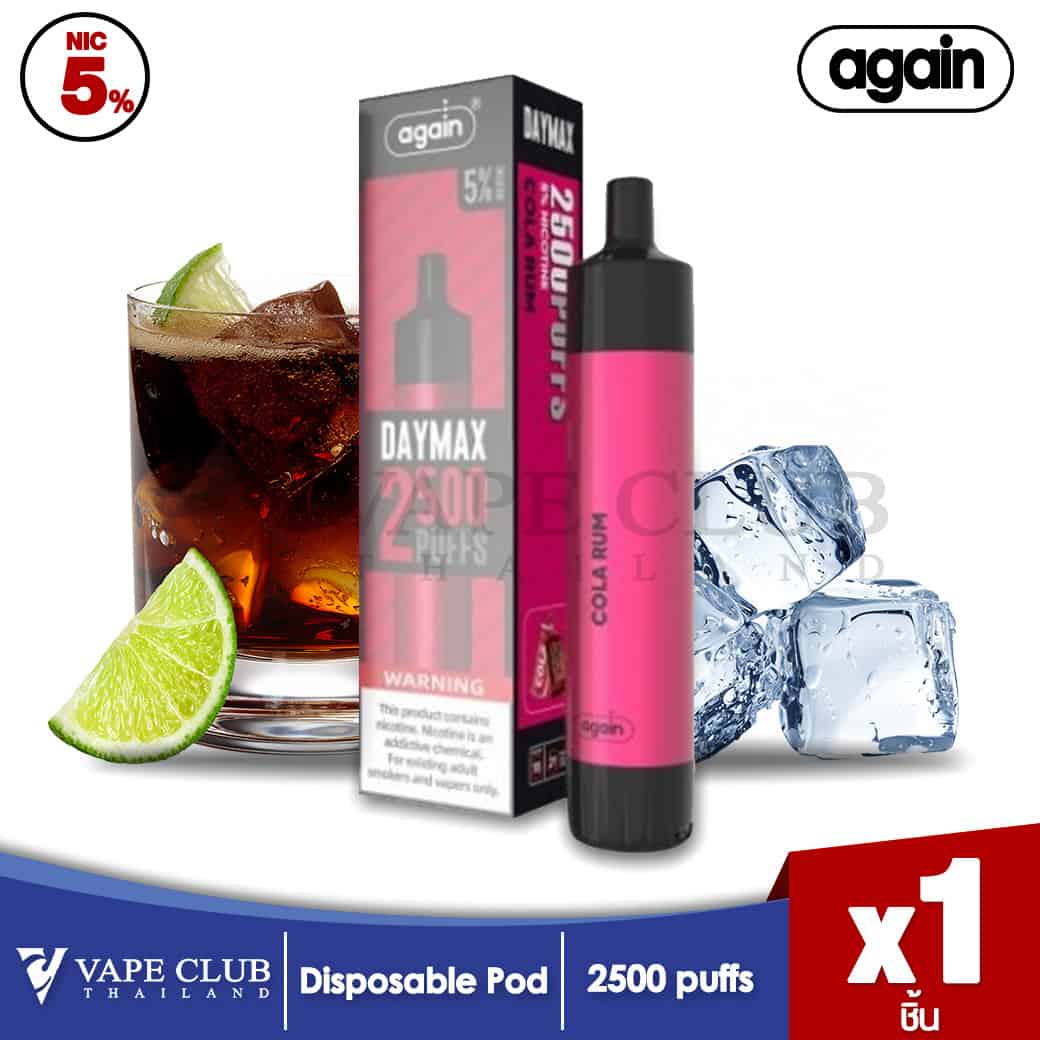 Again Day Max Disposable pod เป็นบุหรี่ไฟฟ้าแบบใช้แล้วทิ้ง แบตเตอรี่ในตัวเครื่อง 1500 mAh สามารถสูบได้มากถึง 2500 คำ โดยปริมาณนิโคติน 5% หรือนิค 50 mg เป็นฟีลสูบ MTL คล้ายการสูบบุหรี่มวน นั่นคือ อม แล้ว ซื้ด นั่นเอง