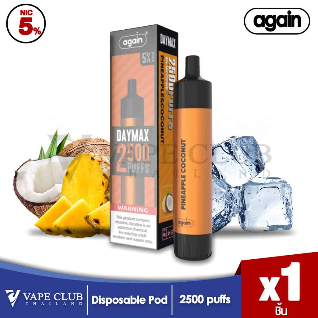 Again Day Max Disposable pod เป็นอีกหนึ่งสินค้าในตระกูลบุหรี่ไฟฟ้าแบบใช้แล้วทิ้ง ที่ทาง Vapeclub Thailand ภูมิใจนำเสนอครับ โดยตัวนี้เป็นรุ่นที่สามารถสูบได้ยาวนาน ที่สำคัญรสชาติของน้ำยาถือว่าเทพมากเลยทีเดียว