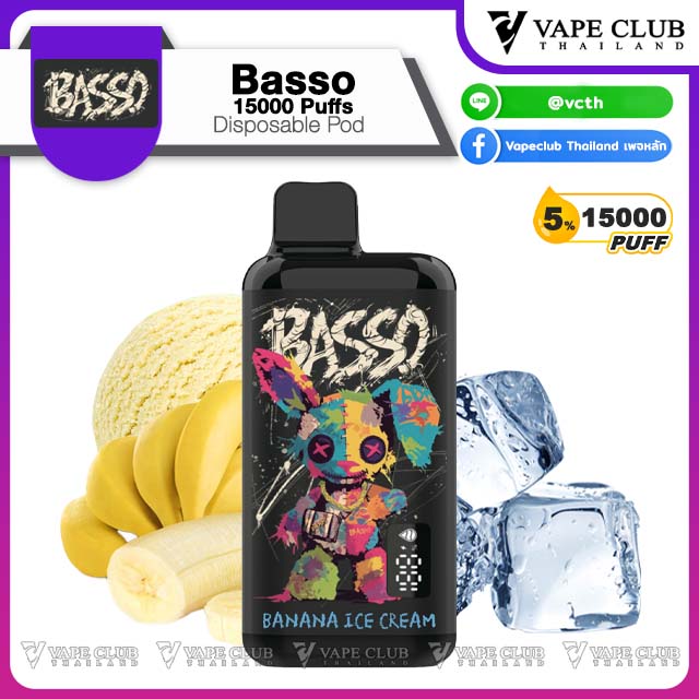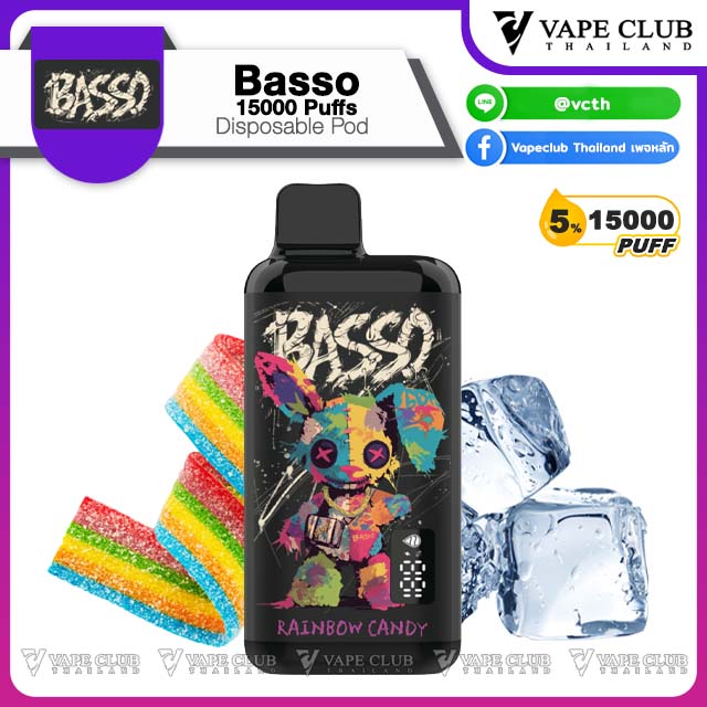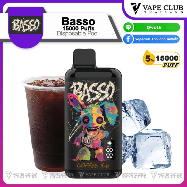 พอตใช้แล้วทิ้งแบรนด์ Basso มาในรูปทรงเหลี่ยมพกพาง่าย สามารถสูบได้ถึง 15000 คำ มีลวดลายเป็นเอกลักษน์เฉพาะตัว บรรจุน้ำยา 30ml พร้อมแบต 650 mAh มีหน้าจอบอกปริมาณน้ำยา และแบตเตอรี่ สามารถชาร์จไฟได้ด้วยสาย USB Type-C