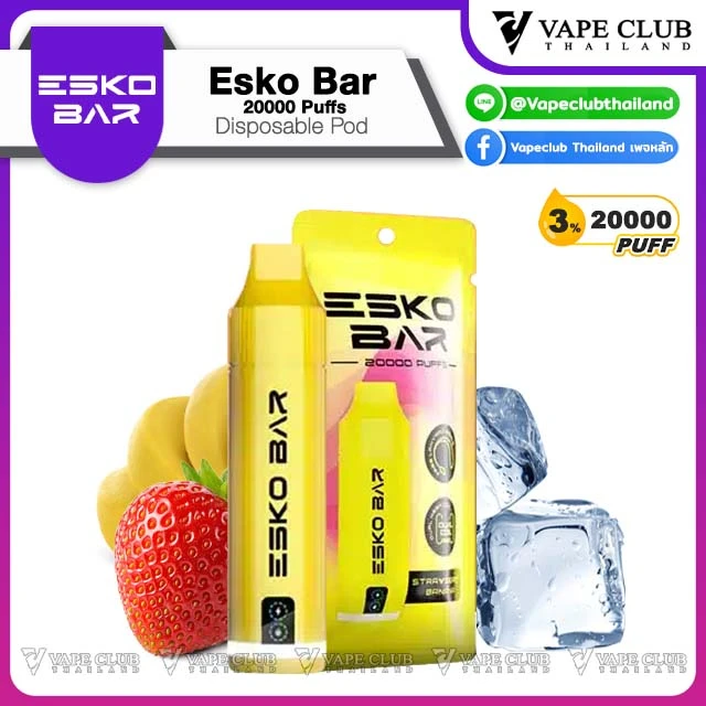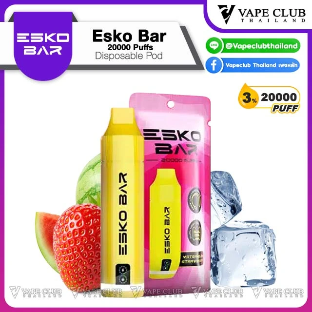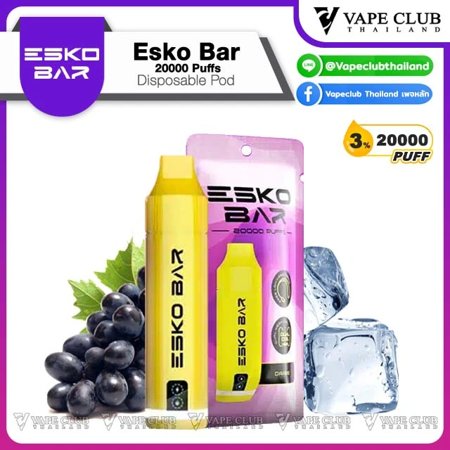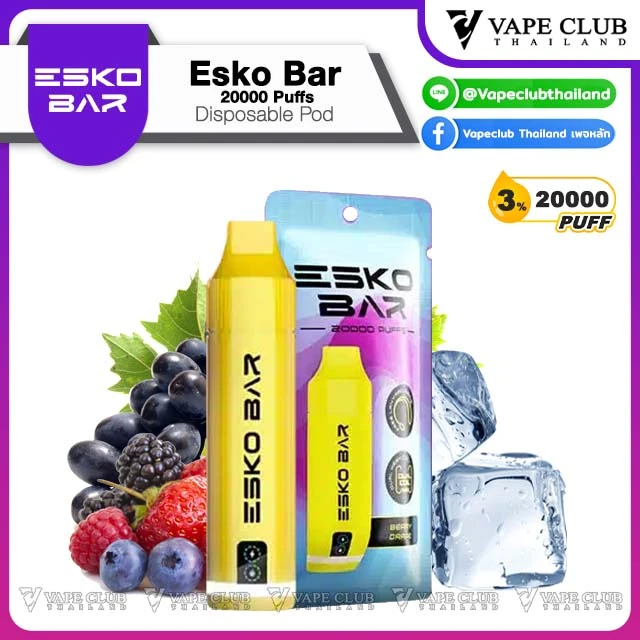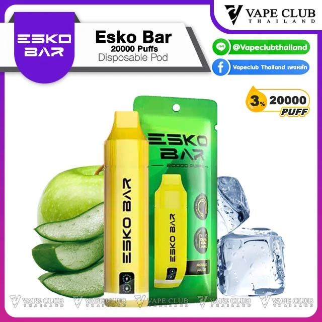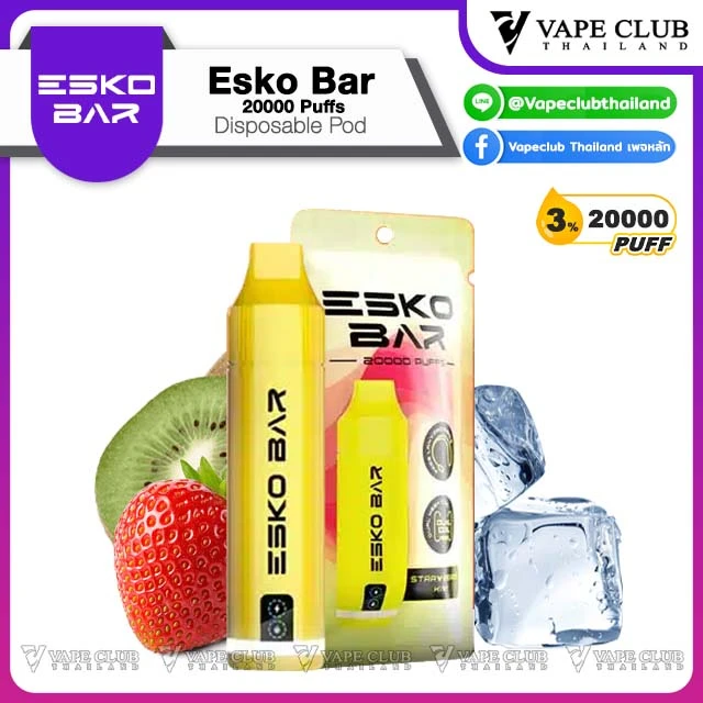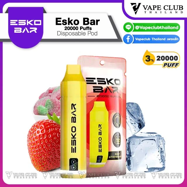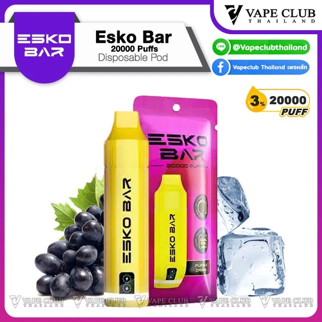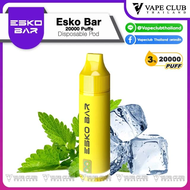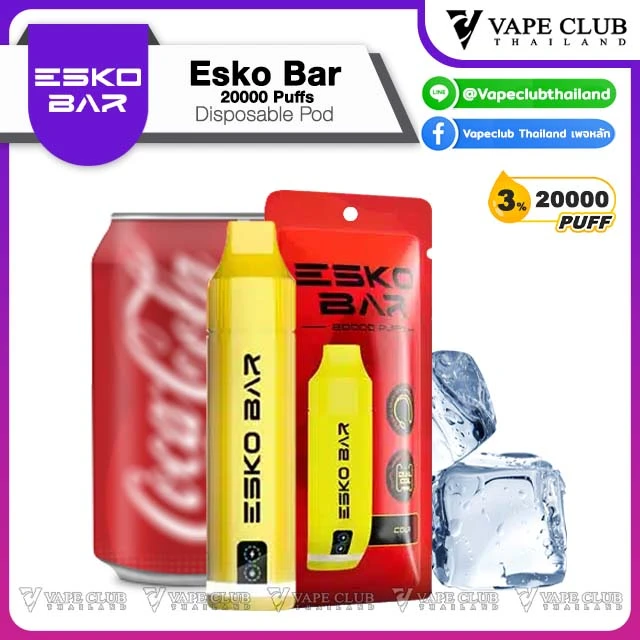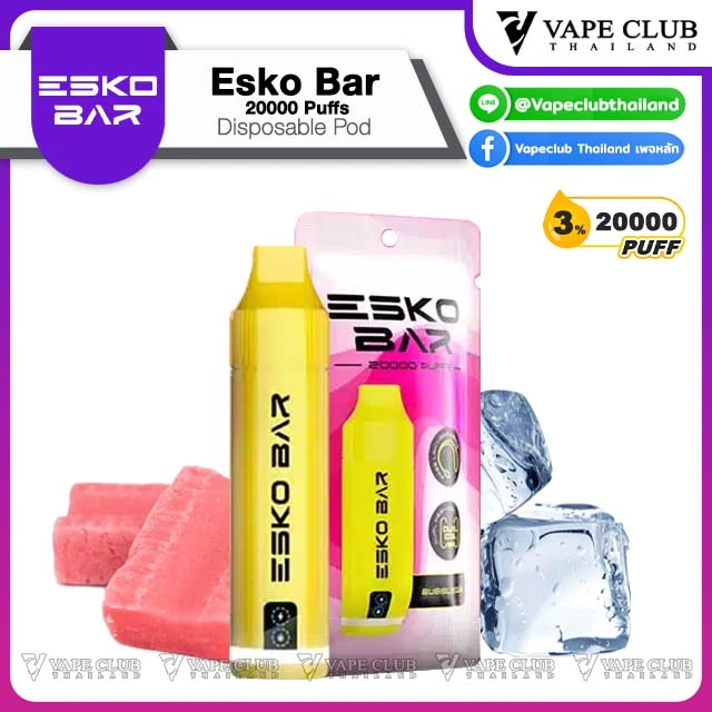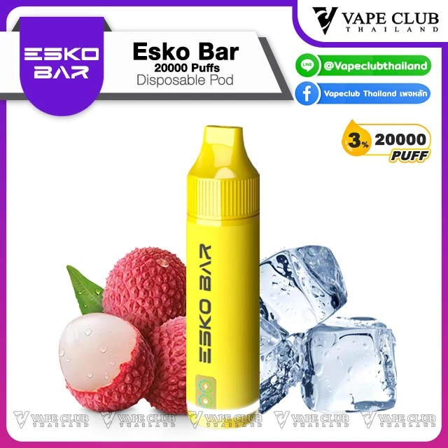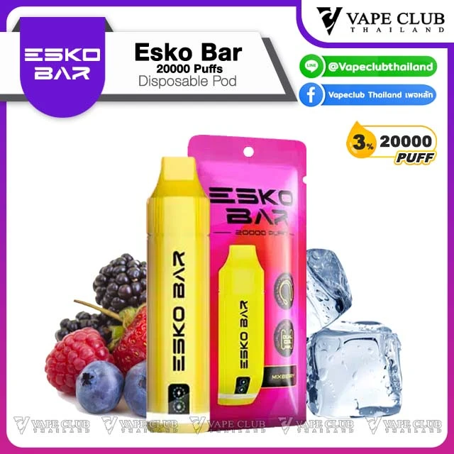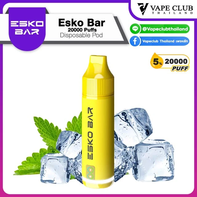 - Esko Bar 20000 Puffs Disposable Pod มีดีไซน์ขนาดเล็กกะทัดรัด น้ำหนักเบา สีสันสดใส เวลาสูบมีไฟแสดงผลที่สวยงาม