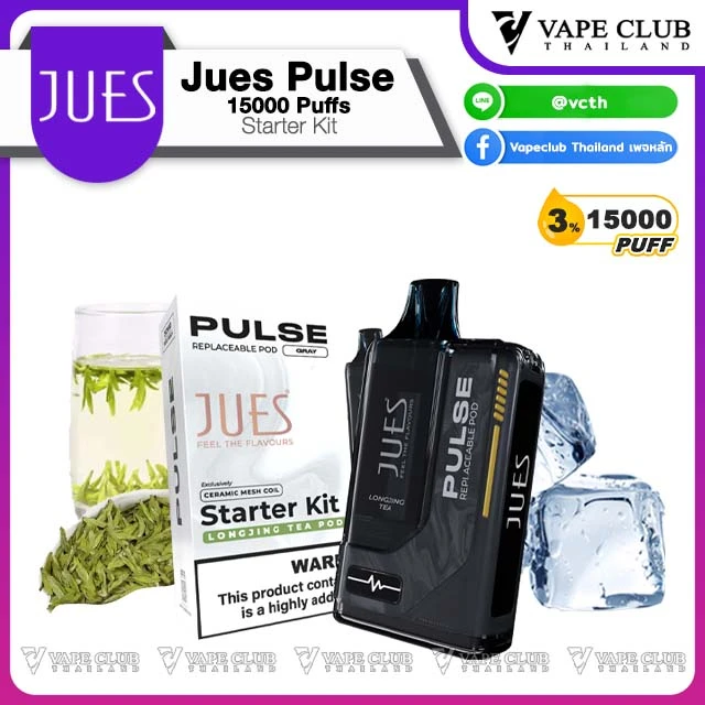 Jues Pulse Starter Kit 15000 Puffs (เครื่อง+หัวน้ำยา) พอตใช้แล้วทิ้งแบบเปลี่ยนหัวน้ำยาได้ ตัวใหม่ล่าสุดจากค่าย Jues ที่รอบนี้อัพเกรดฟีเจอร์มาแบบล้ำๆ พร้อมน้ำยาที่มากถึง 15,000 คำ
