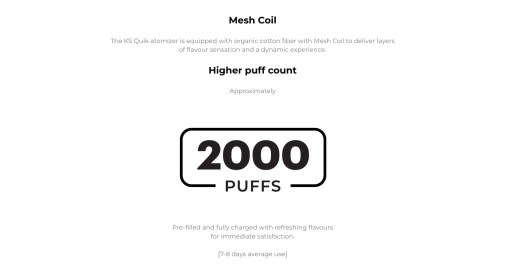 จุดเด่นของน้ำยา KS Quik 2000 Puffs Disposable Pod ตัวนี้คือการที่ให้ฟีลสูบแบบบุหรี่จริงๆและตัวน้ำยายังหมดปัญหาเรื่องกลิ่นเพี้ยนอีกด้วย ด้วยการใช้ Mesh coil ขนาด 1.2 ohm