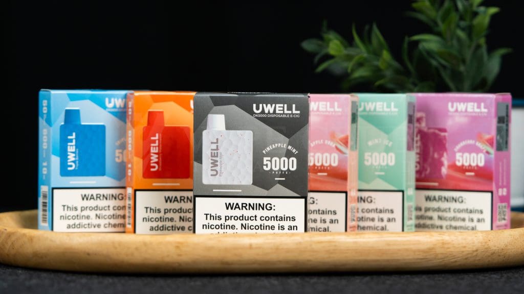 พอตใช้แล้วทิ้งตัวล่าสุดมาแรง จากค่ายผู้ผลิตชื่อดังอย่าง Uwell รอบนี้มาในสไตล์ทรงกล่องสี่เหลี่ยมเก๋ ๆ นอกจากนี้ยังมีการพิมพ์ลายหินอ่อน เพิ่มฟีลหรูหรา และเพิ่มพื้นผิวแบบขรุขระบนตัวเครื่องอีกด้วย ทำให้ดูแปลกตา แต่จับถนัดมือขึ้น มาพร้อมกับปากสูบแบน ทรงเข้ากับรูปปากเวลาสูบ วัสดุตัวเครื่องทำจาก PC + PCTG มีไฟบอกสถานะแบตเตอรี่อยู่ที่ด้านใต้เครื่อง มีรสชาติให้เลือกถึง 10 กลิ่น โดยโทนกลิ่นที่โดดเด่นของ Uwell DK5000 Disposable pod จะเน้นไปทางกลิ่นผลไม้สายเย็น
