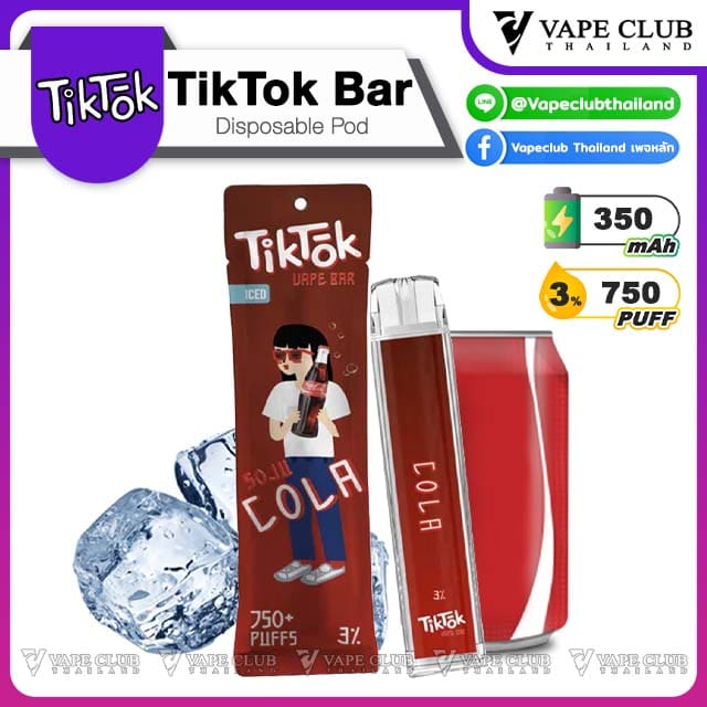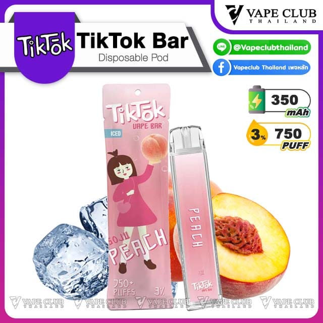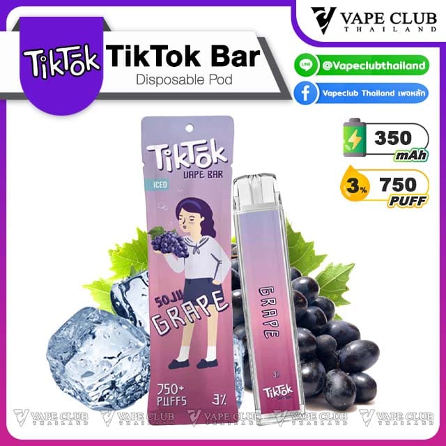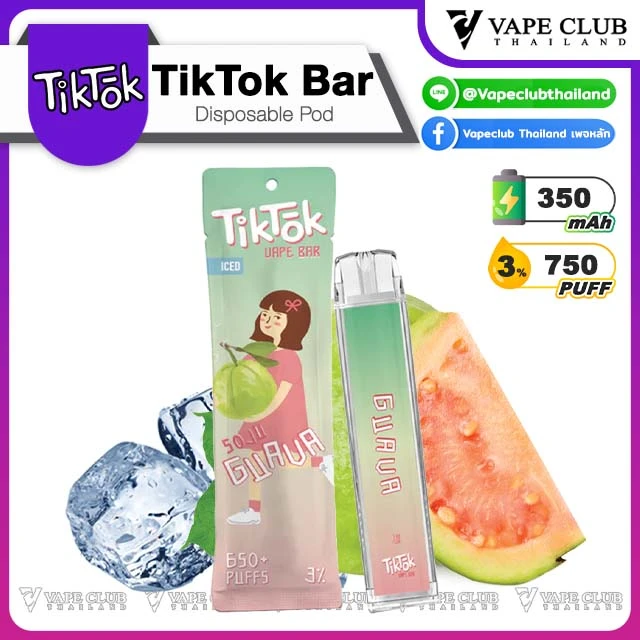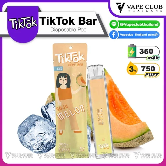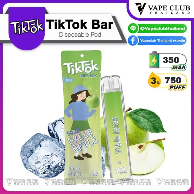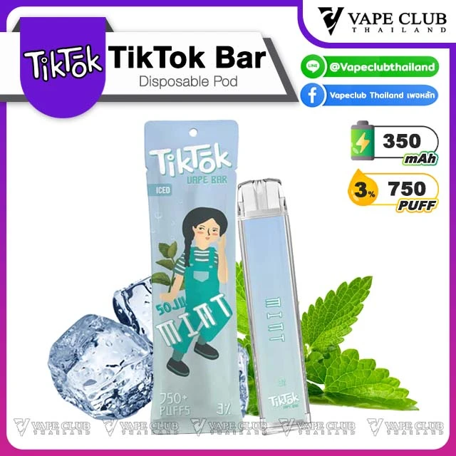 แบบใช้แล้วทิ้ง TikTok Vape Bar เป็นผลิตภัณฑ์ Vape Pod แบบใช้แล้วทิ้งใหม่ที่มี 11 รสชาติใหม่กลิ่นโซจูผสมกับผลไม้ต่างๆ ที่เข้ากันได้อย่างลงตัว หอมเป็นเอกลักษณ์เฉพาะของ TikTok Vape Bar มีความเข้มข้นนิโคติน 3% อิ่ม ไม่แทงคอ เย็นกำลังดี สูบได้สูงสุดอยู่ที่ 750 คำเทียบกับบุหรี่ถึง 37 มวลเลยทีเดียว
