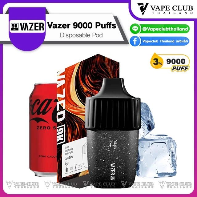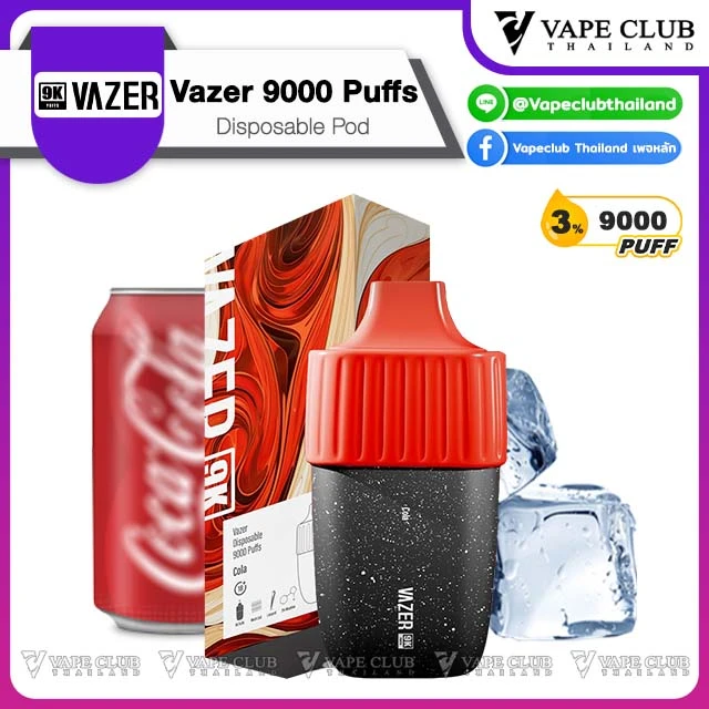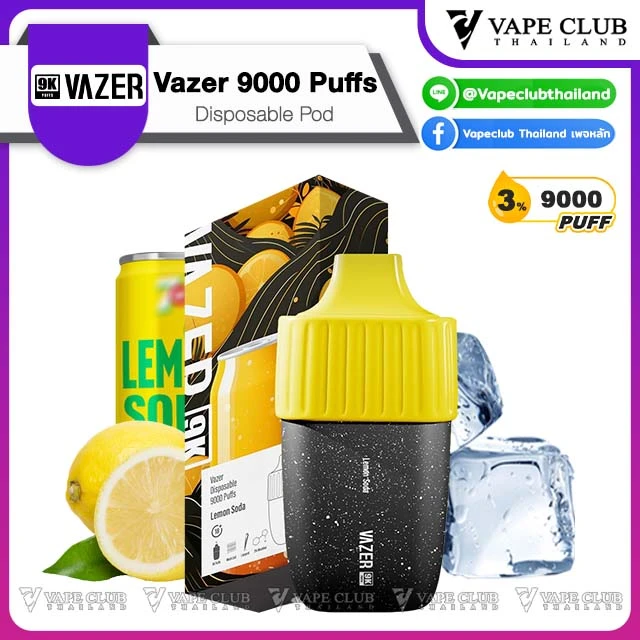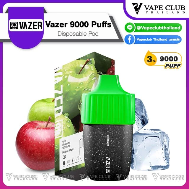 พอตใช้แล้วทิ้งจากค่าย Vazer ที่มาในขนาดคำสูบถึง 9000 คำ สูบได้เต็มอิ่มจุใจ ด้วยปริมาณ 18 ml และด้วยนิคโคตินขนาดตั้งแต่ 0% ถึง 3% ทำให้บอกเลยว่าสูบได้เต็มอิ่ม และได้ฟีลสูบแบบ MTL ที่เหมือนสูบบุหรี่ทั่วไปเลยทีเดียว ภายในเป็นแบตเตอรี่ขนาด 550 mAh ใช้งานได้ยาวๆ โดยไม่ต้องห่วง และยังมีรูชาร์จสำหรับ USB Type-C สามารถชาร์จซ้ำได้ และสามารถสูบแบบออโต้ได้เลย