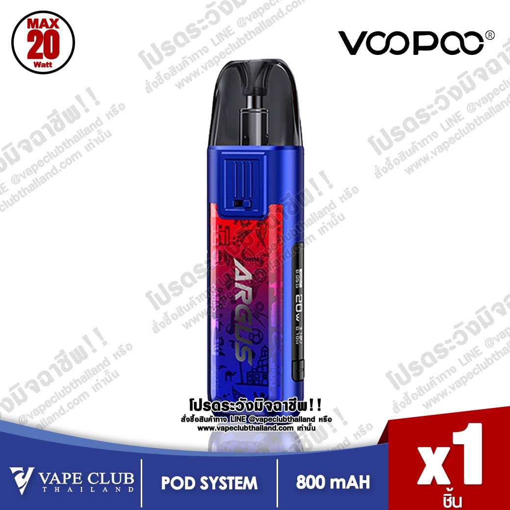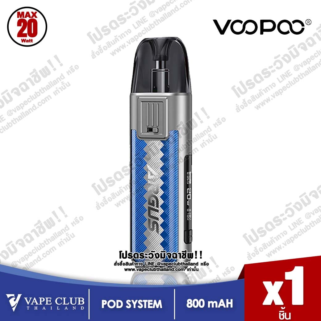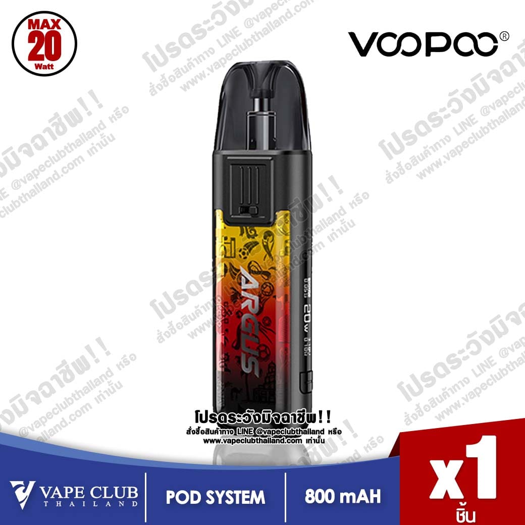 Voopoo ARGUS Pod Kit มาพร้อมแบตเตอรี่ 800 mAh ซึ่งสามารถปรับไฟได้ตั้งแต่ 5-20 w โดย Cartridge มีมาแบบค่าโอห์ม 0.7 / 1.2 ซึ่งสามารถเติมน้ำยาได้ 2 ml