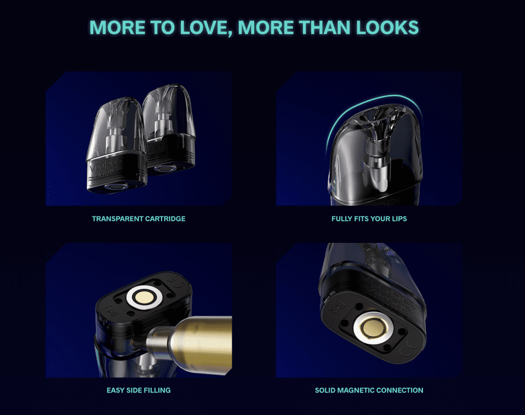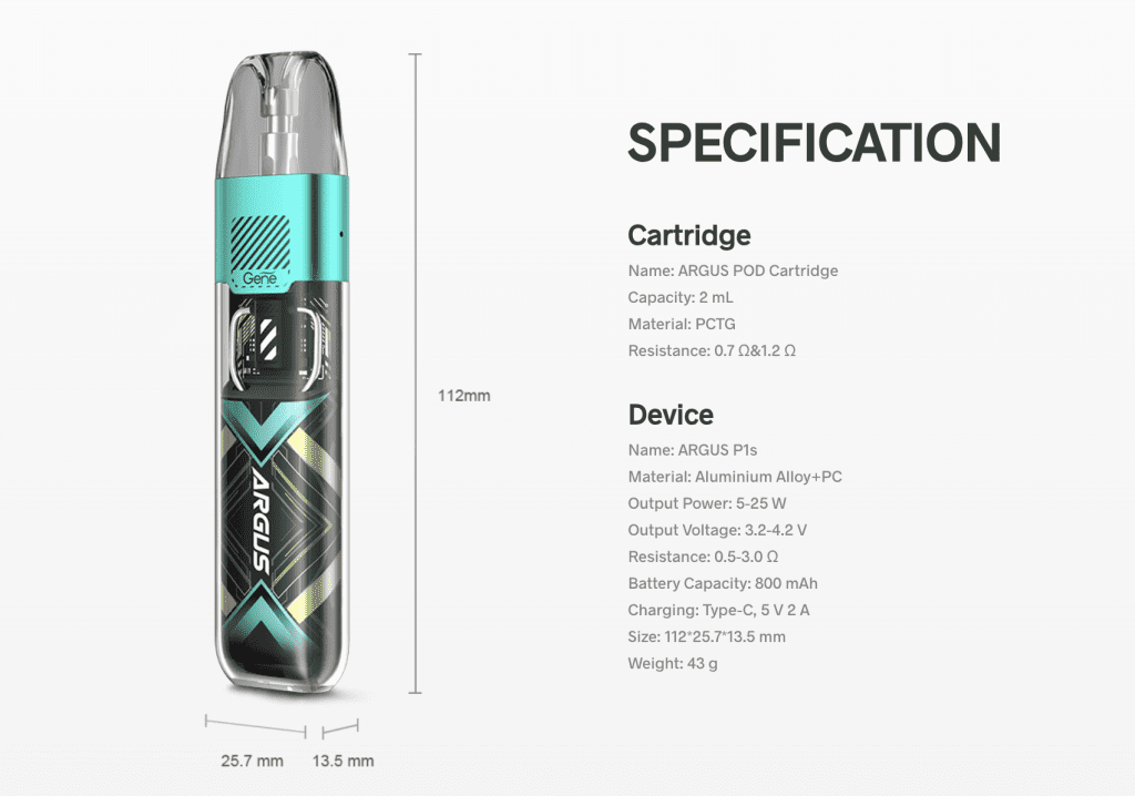 วัสดุตัวเครื่องเป็น Aluminum Alloy + PC ดีไซน์ตัวเครื่องทรงแท่ง ดีไซน์สวยงามทั้งการยิงลายลูกเล่นต่างๆในตัวเครื่องและตรงกลางยังเป็นแบบใสทำให้เห็นภายในของตัวเครื่องและไฟสถานะแบบ Cyberpunk Lights ที่สามารถปรับเปลี่ยนสีได้ในขณะสูบ และชาร์จแบตเพิ่มความเท่ห์ขึ้นไปอีก ขนาดของเครื่อง 117.3mm x 25.7mm x 13.5mm