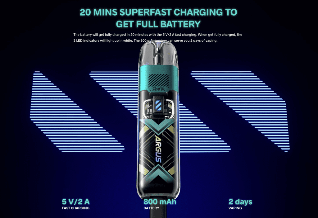 แบตเตอรี่ในตัวขนาด 800 mAh รองรับกับคอยล์ในรุ่น Argus ได้ทุกรุ่น ตัวเครื่องมีระบบแม่เหล็กยึดติดกับหัวพอตได้อย่างแน่นหนา มีระบบป้องกันตัวเครื่อง 4 ฟังค์ชั่น ได้แก่ Overtime Protection / Short-Circuit Protection / Overcharge Protection / Low Battery Protection