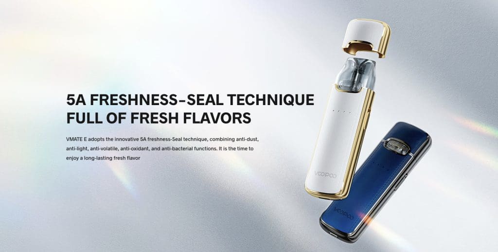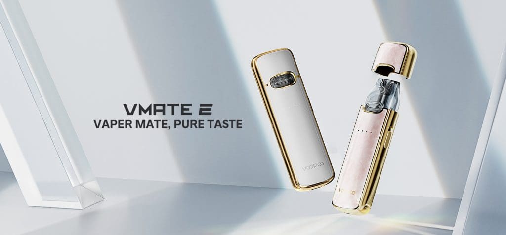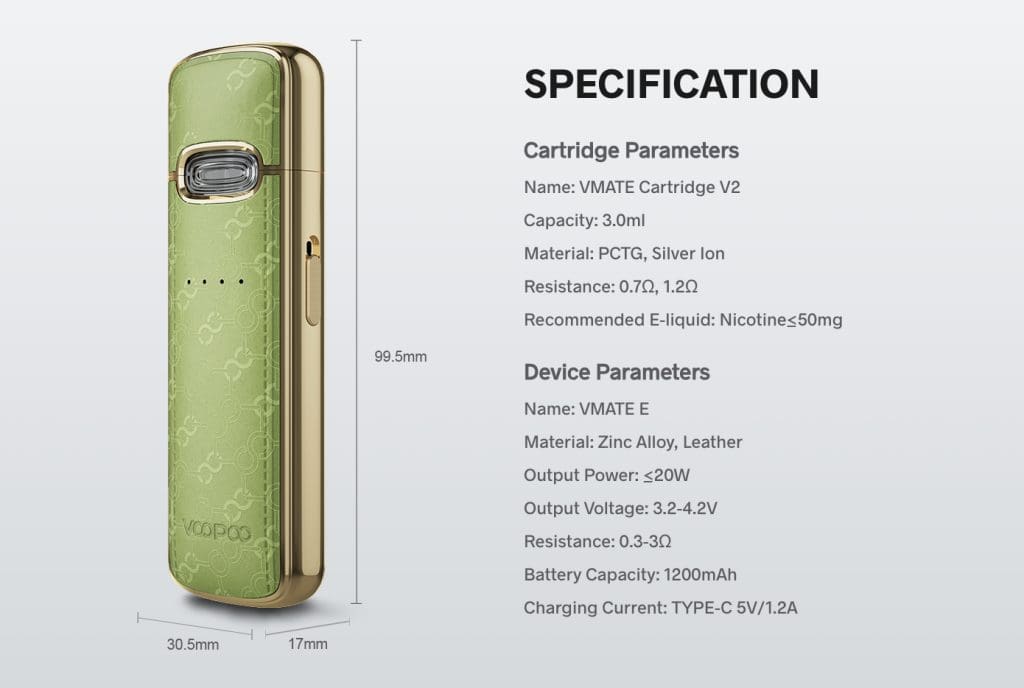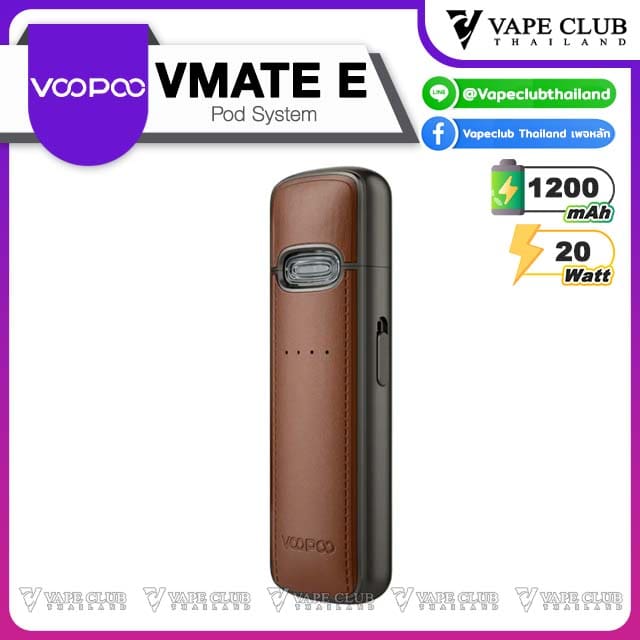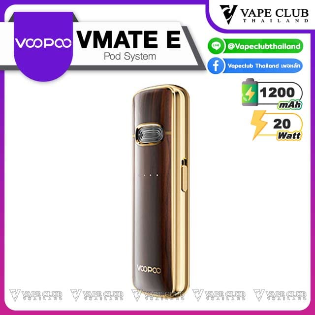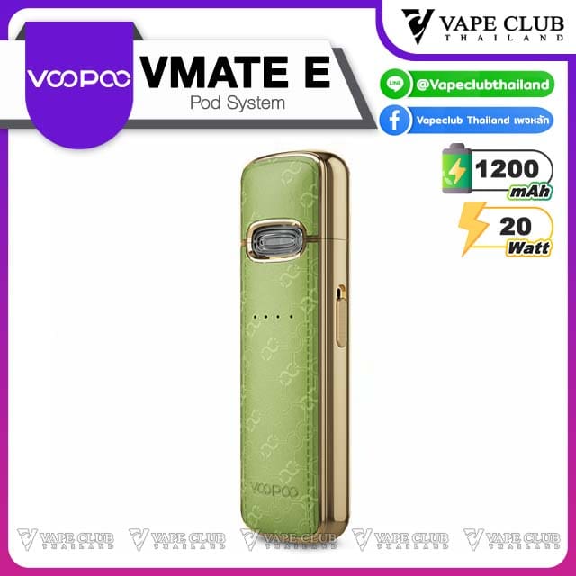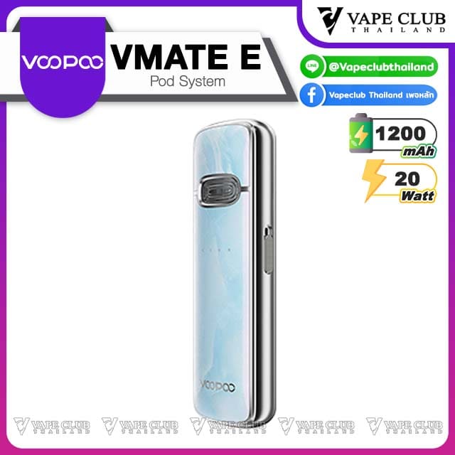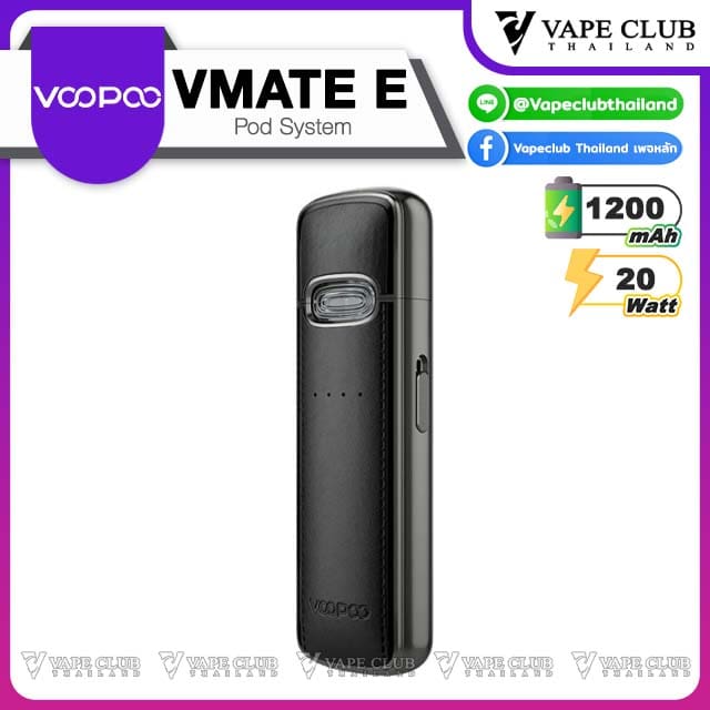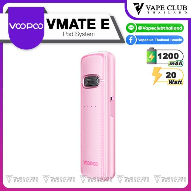 VOOPOO VMATE E Pod Kit แบตเตอรี่ในตัว 1200mAh พร้อมการชาร์จแบบ Type-C จ่ายไฟสูงสุด 20W มีไฟแสดงสถานะ LED เพื่อแสดงความจุของแบตเตอรี่แบบเรียลไทม์ และจับคู่กับรีฟีล VMATE V2 ขนาดจุน้ำยา 3 ml โดยมีมาให้เลือก 0.7ohm และ 1.2ohm เพื่อประสบการณ์การรับรสชาติน้ำยาที่ยอดเยี่ยม